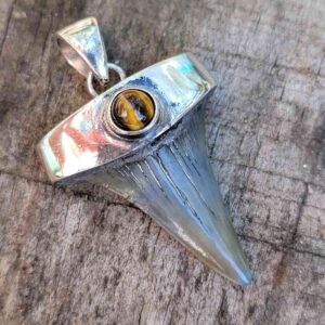 1 1/8" - .925 Sterling Silver Capped Extinct Great White Shark Tooth with Tigers Eye Stone$90.00
