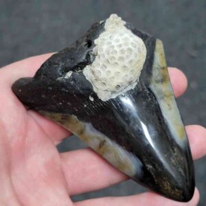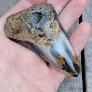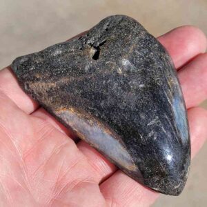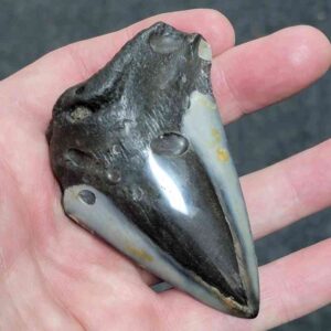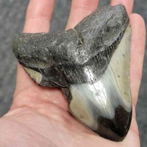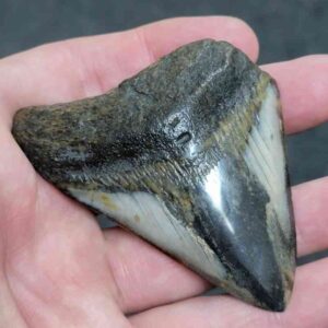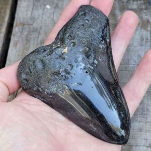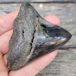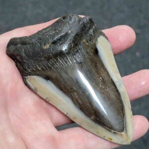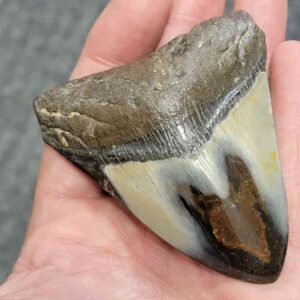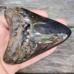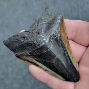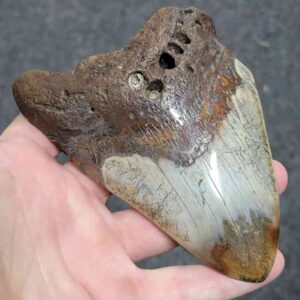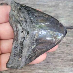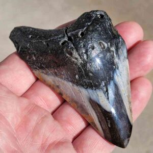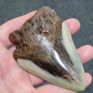 4 1/16" - 90% Complete Polished Megalodon Tooth with Dark Brown Root with Gray Enamel - with Bite Marks$165.00 Add to cart -