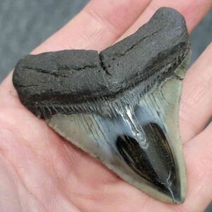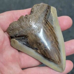 3 5/16" - 90% Complete Polished Megalodon Tooth with Dark Brown Root with Gray Enamel$135.00 Add to cart -