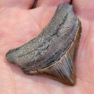 1 5/8 Inch Megalodon tooth with brown root and gray enamel Serrated posterior fossil$80.00 Add to cart -