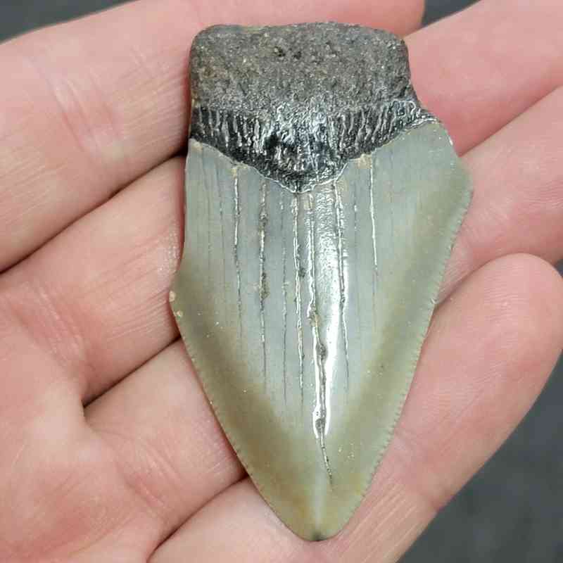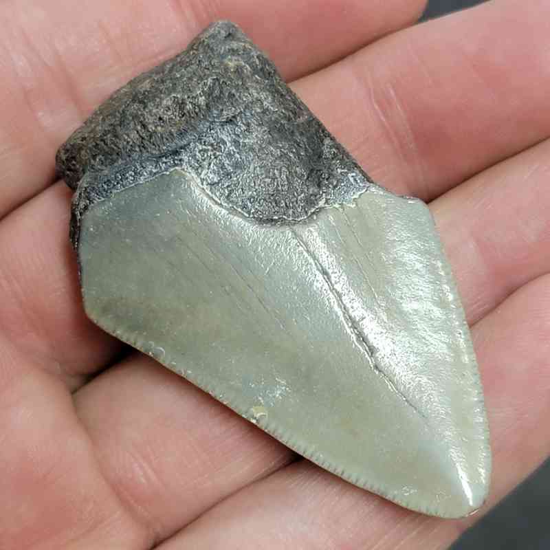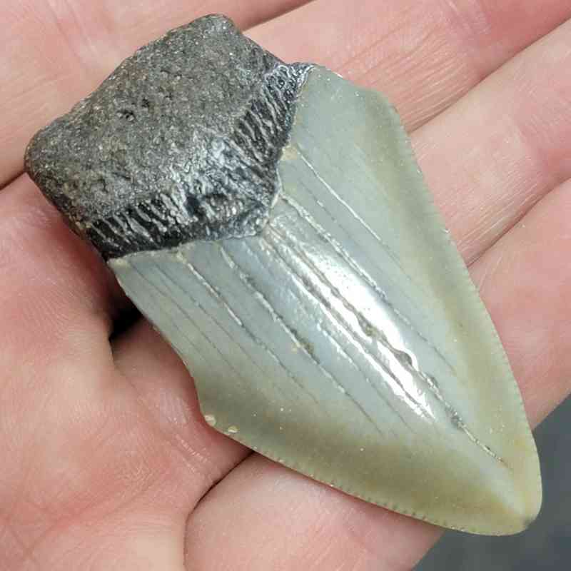 2 1/8″ – 75% Complete Megalodon Shark Tooth with Dark Brown Root with Gray Enamel