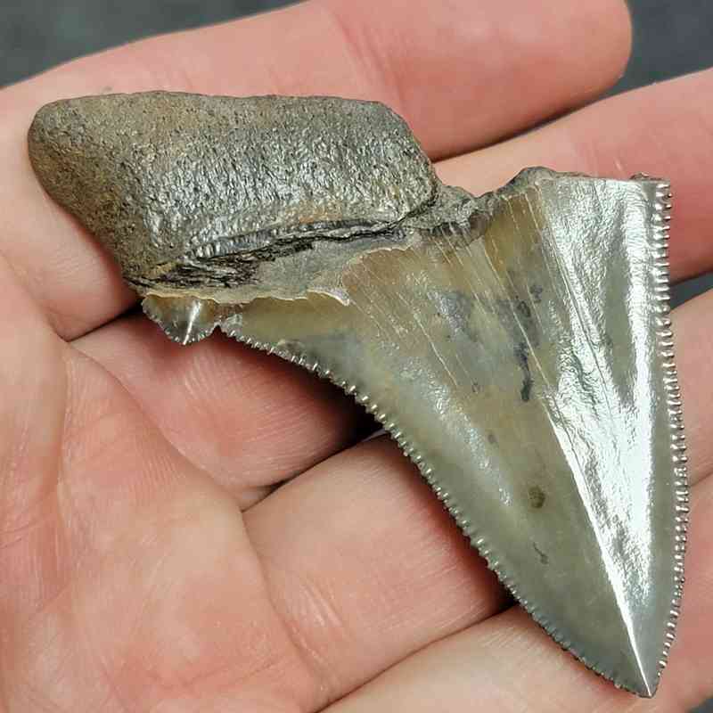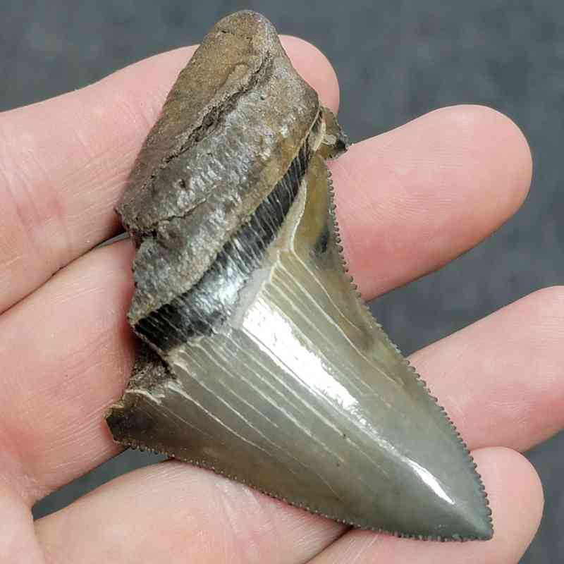 2 3/4+” – 75% Complete Megalodon Shark Tooth with Dark Brown Root with Brown Enamel