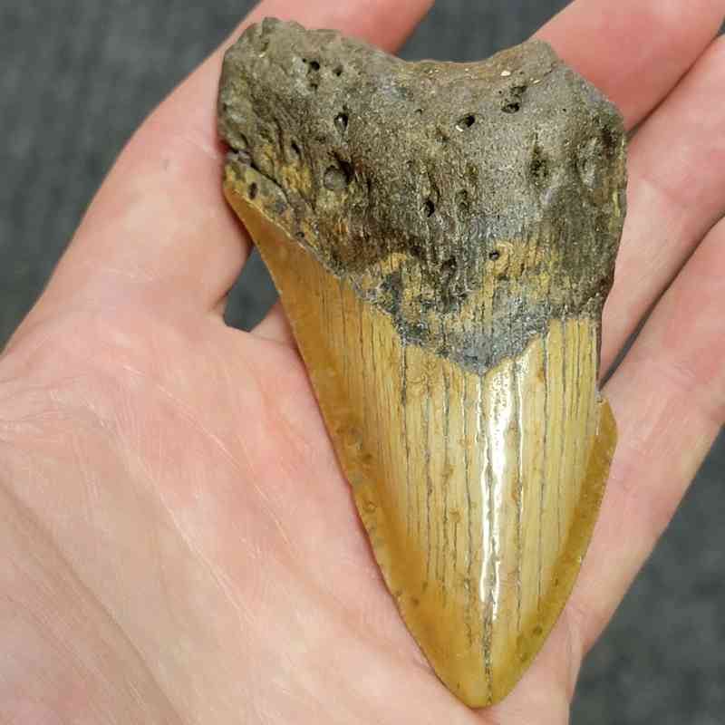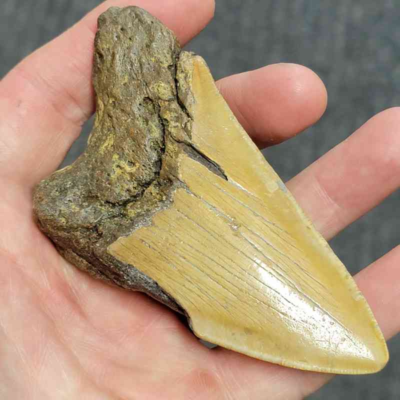 4″ – 75% Complete Megalodon Shark Tooth with Brown Root with Tan Enamel