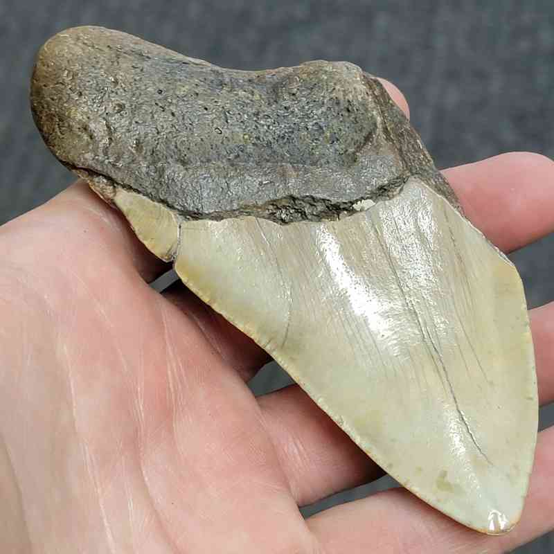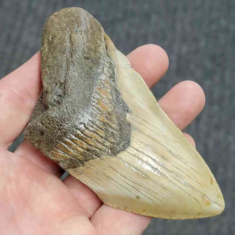 4 1/2″ – 75% Complete Megalodon Shark Tooth with Brown Root with Tan Enamel