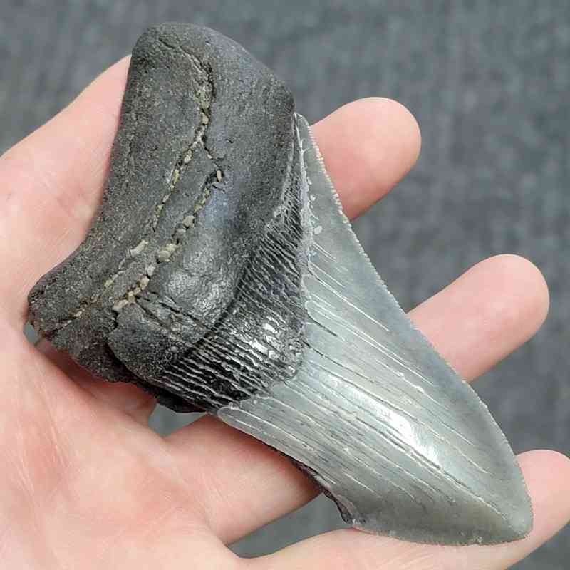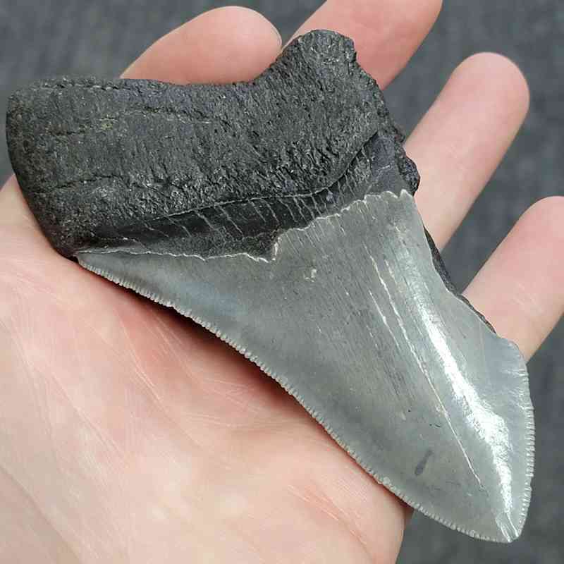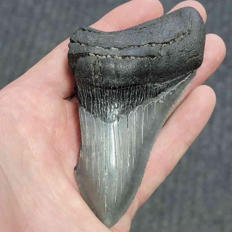 4 3/8″ – 75% Complete Megalodon Shark Tooth with Dark Brown Root with Gray Enamel