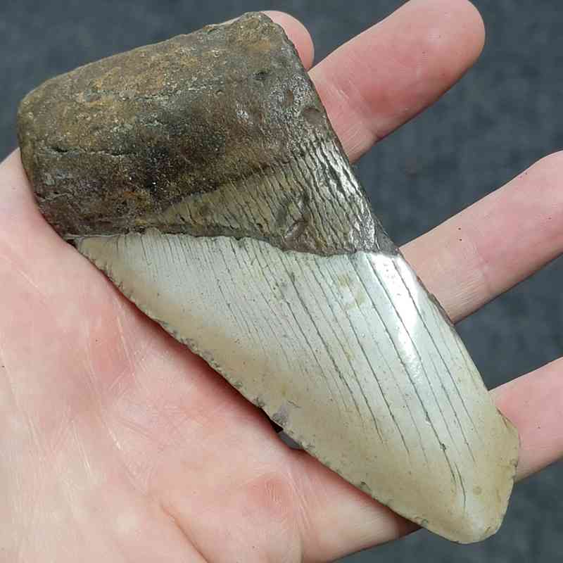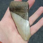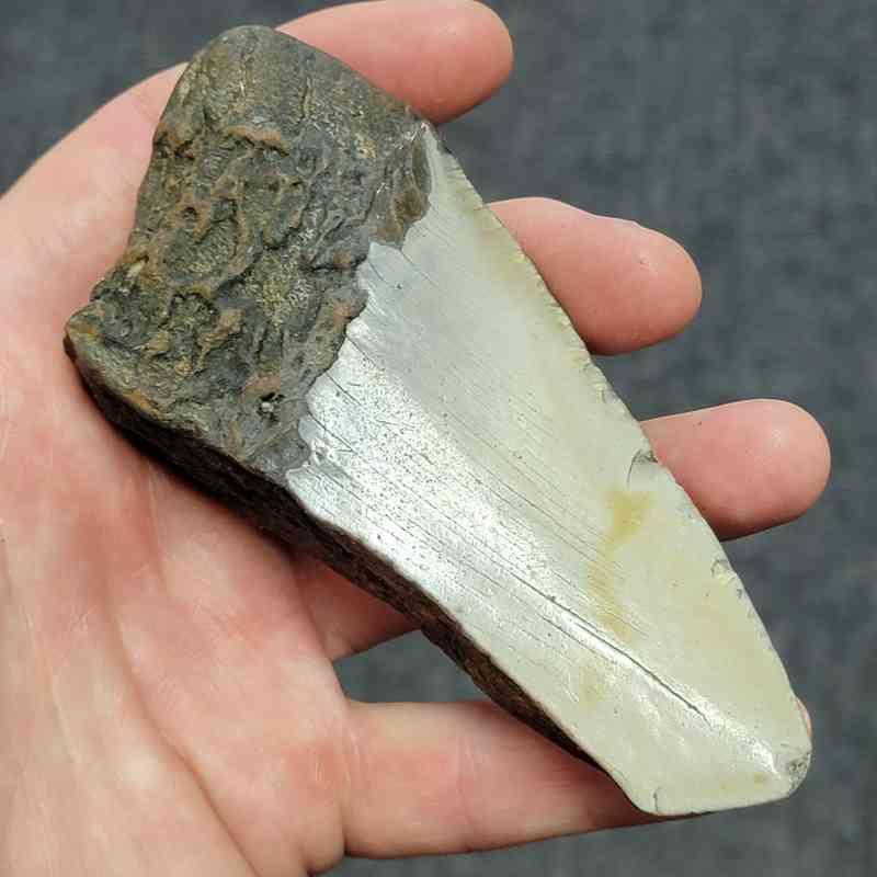 4 5/8″ – 50% Complete Bargain Megalodon Shark Tooth with Brown Root with Gray Enamel
