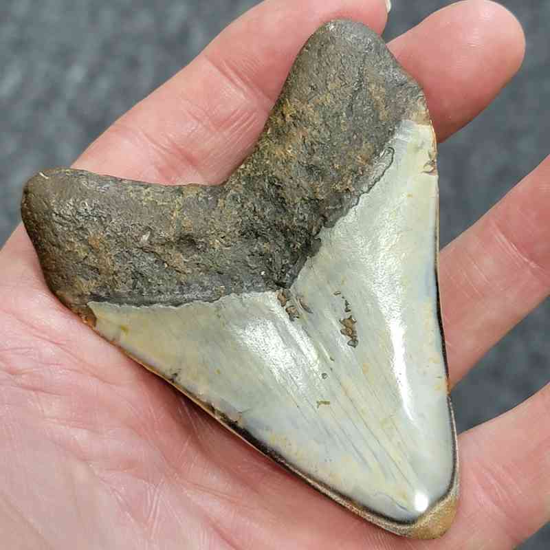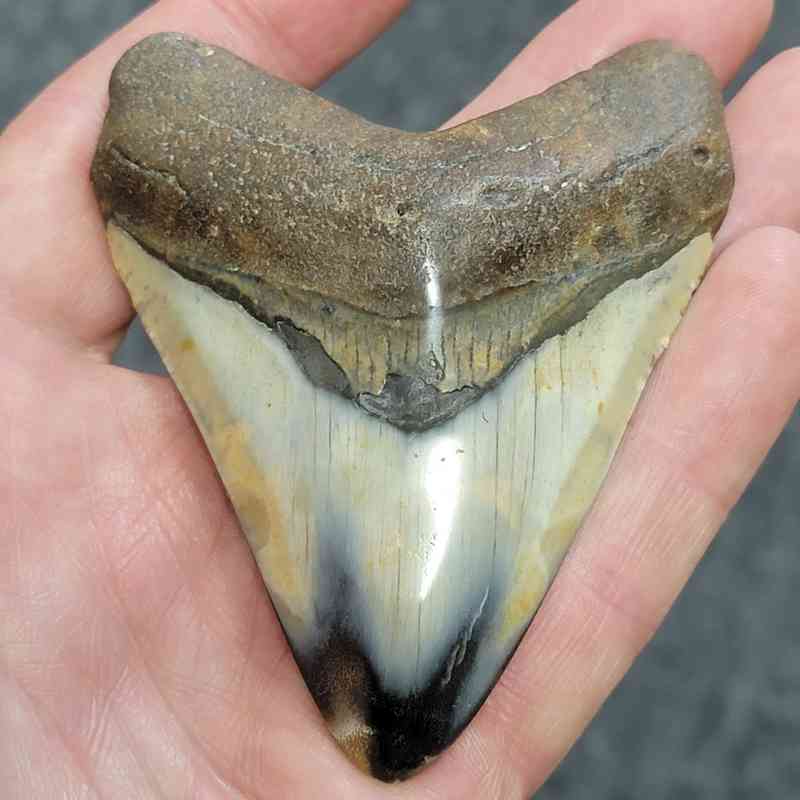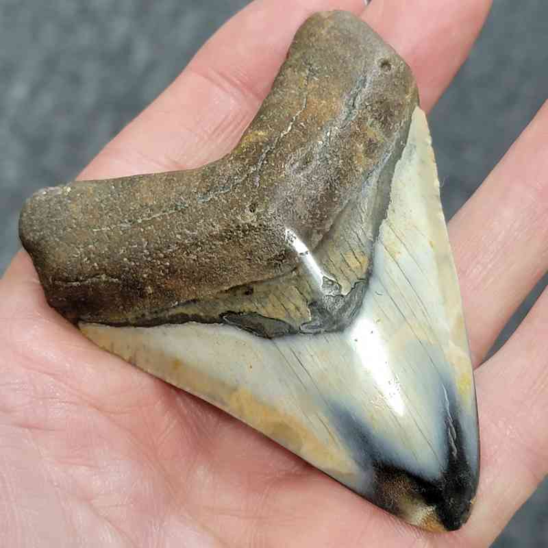 3 3/8″ – Polished Megalodon Tooth with Brown Root with Light Gray Enamel