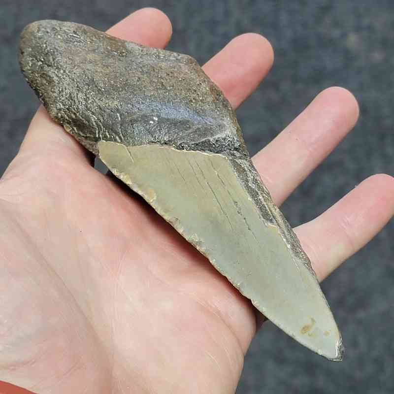 5 3/4″ – 50% Complete Bargain Megalodon Shark Tooth with Brown Root with Tan Enamel