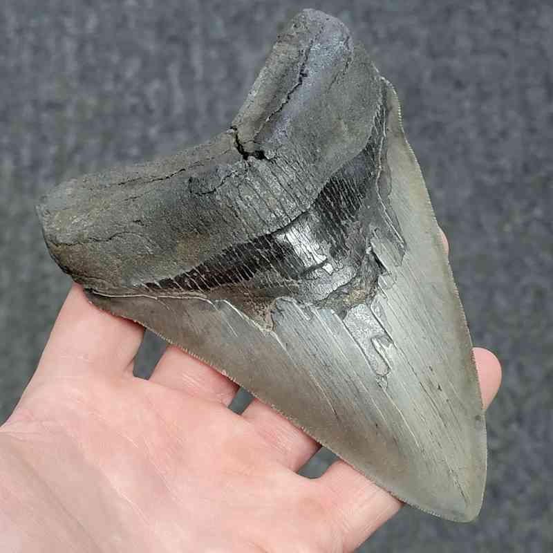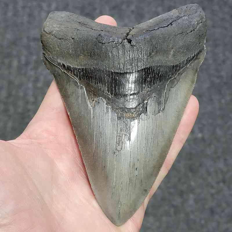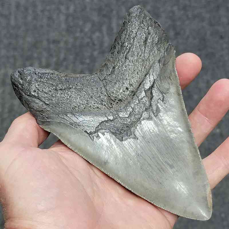 5 13/16″ – Megalodon Shark Tooth with Dark Brown Root with Gray Enamel
