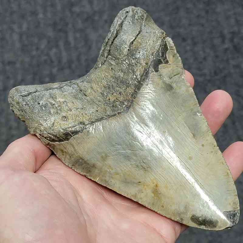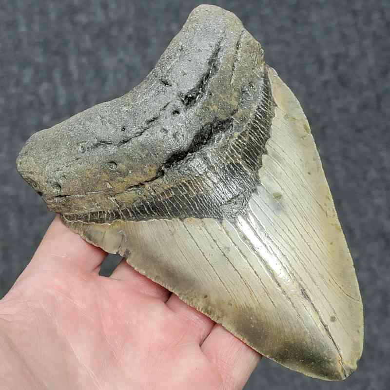 5 3/4″ – Megalodon Shark Tooth with Gray/Brown Root with Tan Enamel