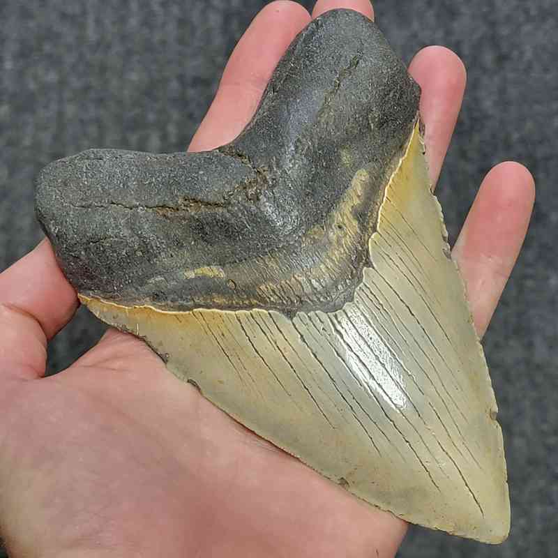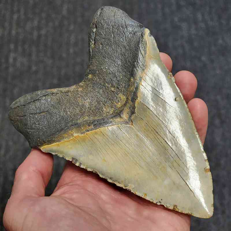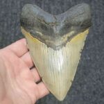 5 15/16″ – Megalodon Shark Tooth with Dark Brown Root with Tan Enamel