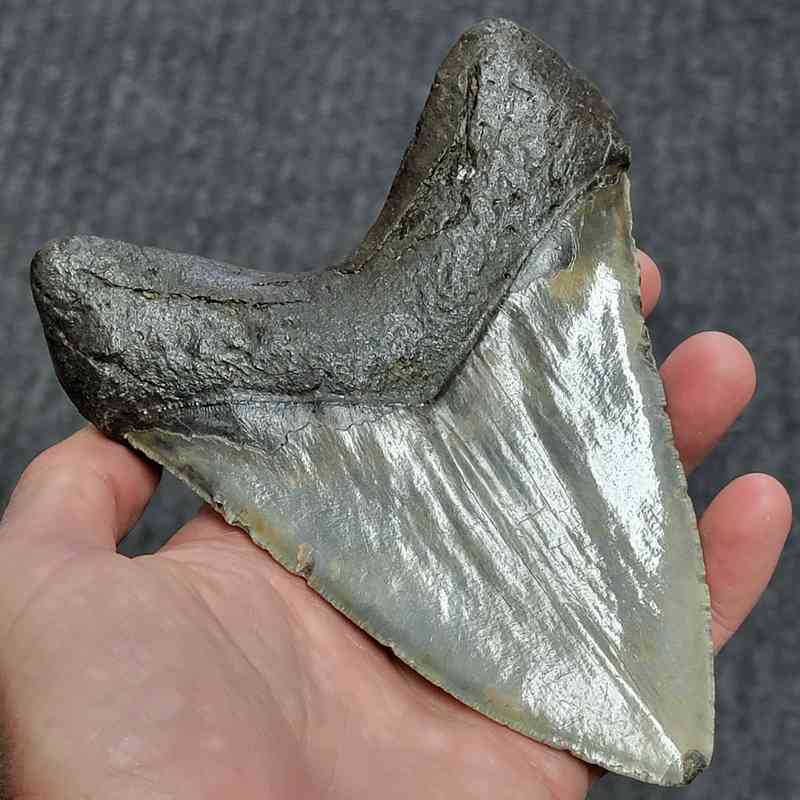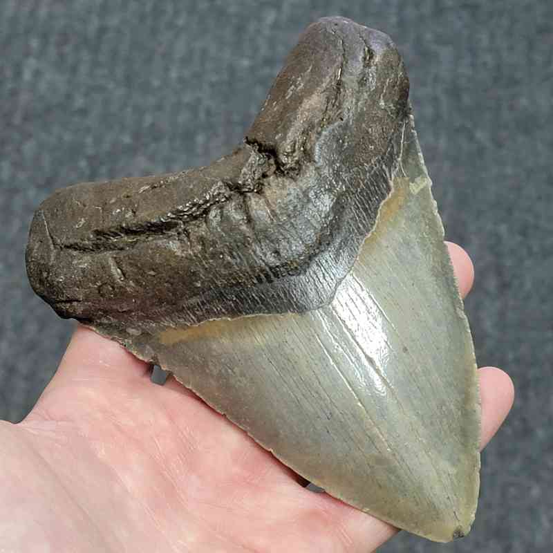 5 7/8″ – Megalodon Shark Tooth with Dark Brown Root with Gray Enamel