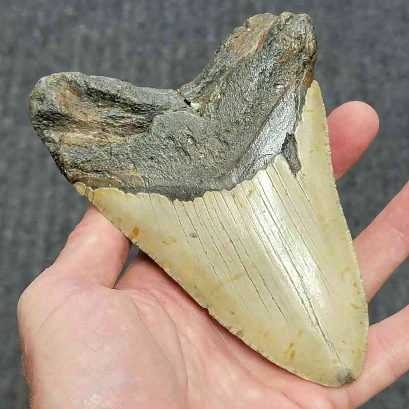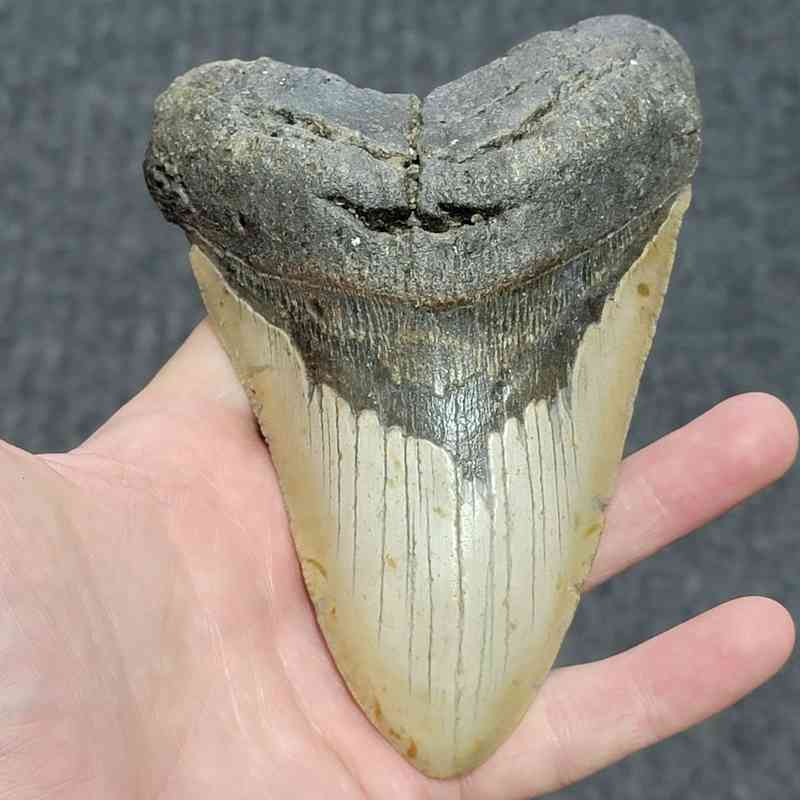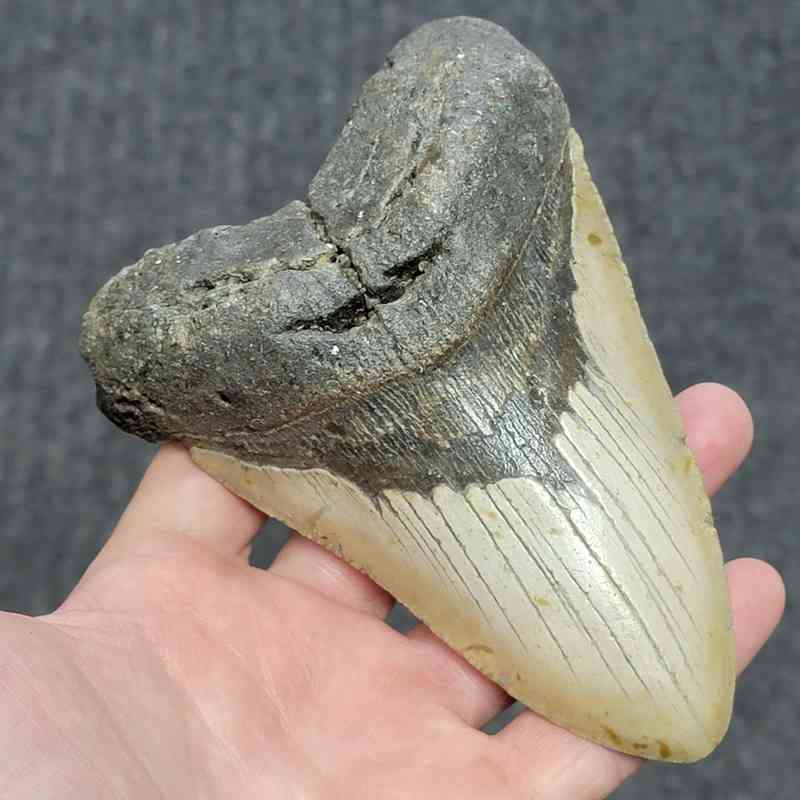 5 3/4″ – Megalodon Shark Tooth with Dark Brown Root with Tan Enamel