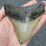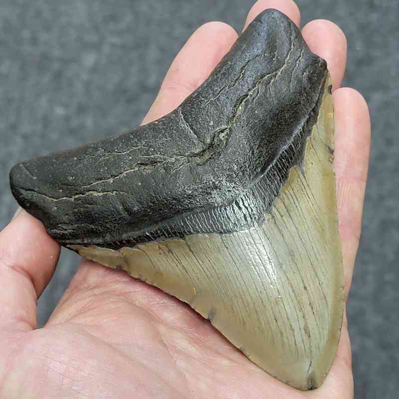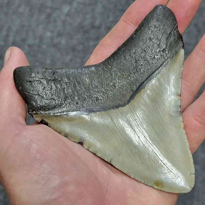 4 3/4″ – Megalodon Shark Tooth with Dark Brown Root with Tan Enamel