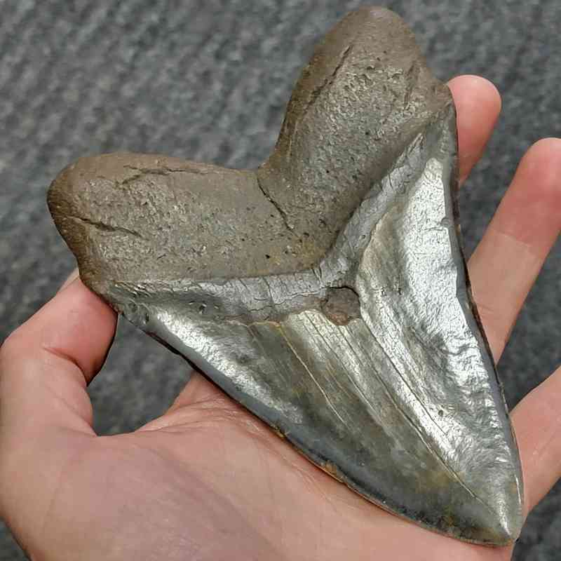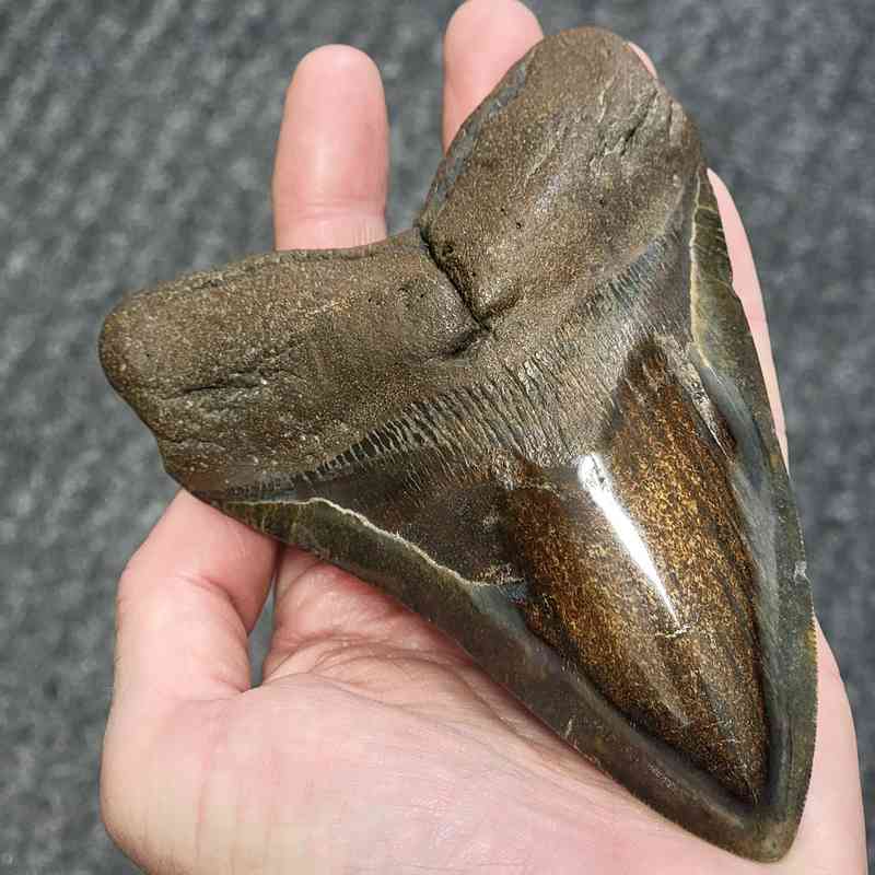 5 3/8″ – Polished Megalodon Tooth with Brown Root with Brown Enamel – Manager’s Choice