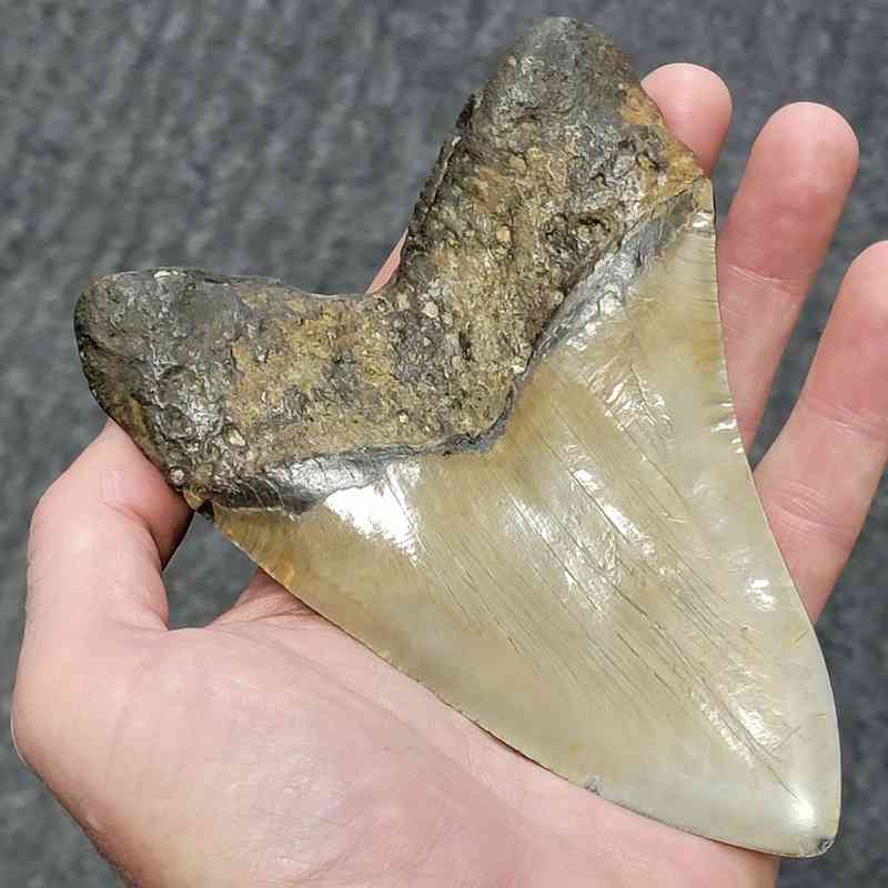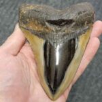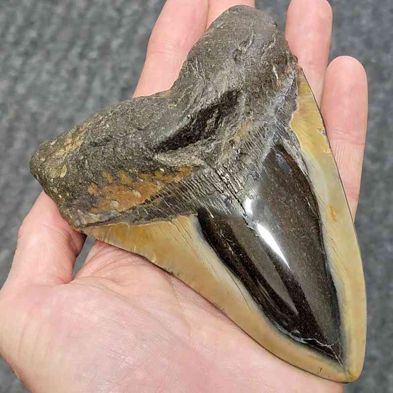 5 7/16″ – Polished Megalodon Tooth with Dark Brown Root with Tan Enamel