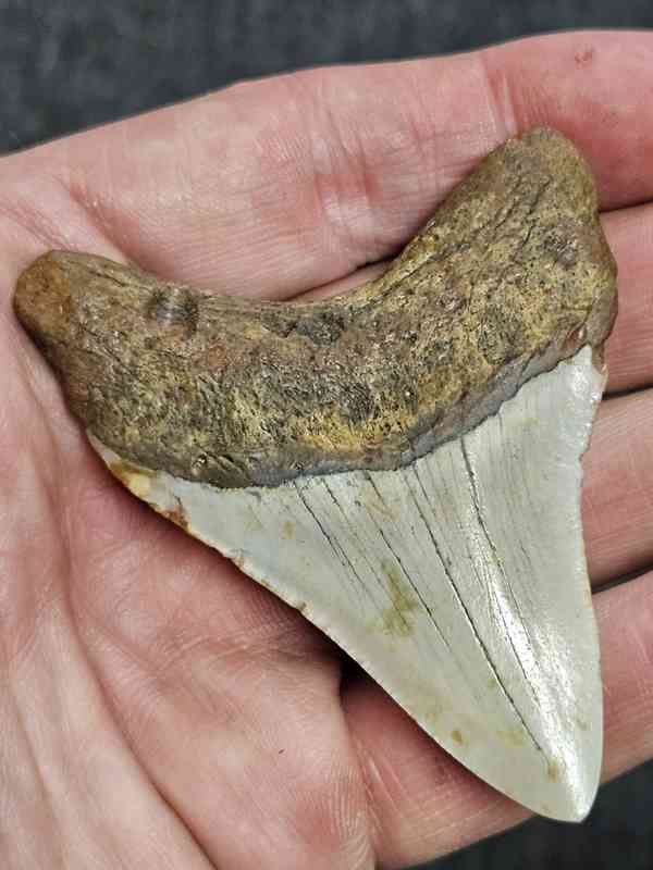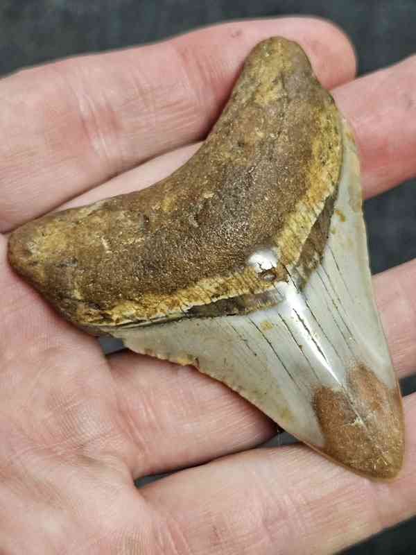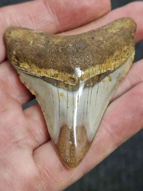 2 3/4″ Polished Megalodon Shark Tooth with Tan Root with Tan Enamel