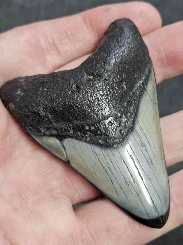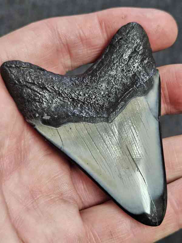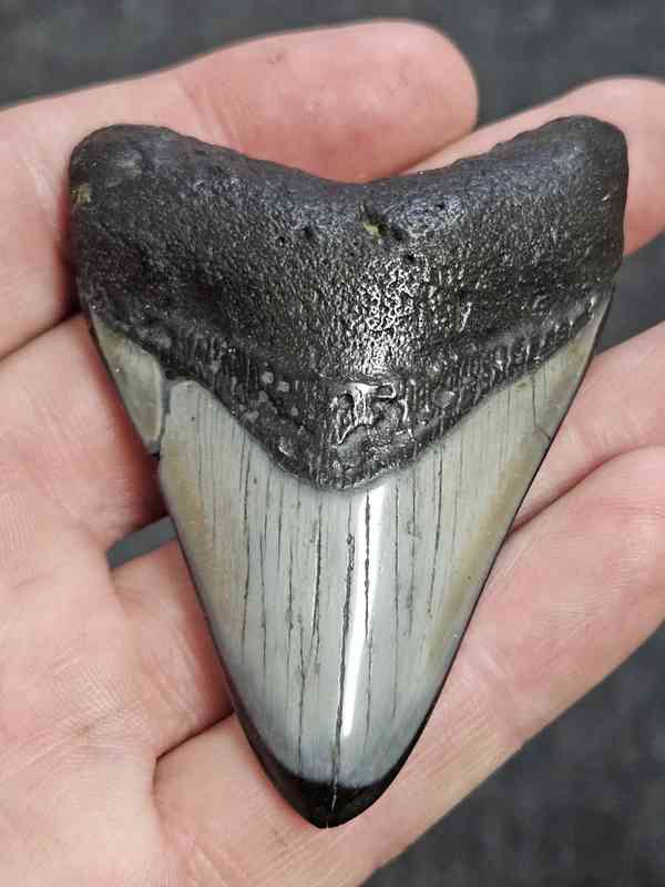 2 15/16″ Polished Megalodon Shark Tooth with Dark Brown Root with Gray Enamel