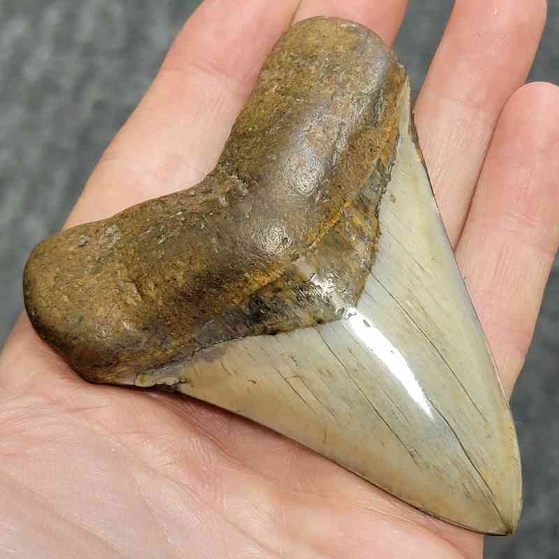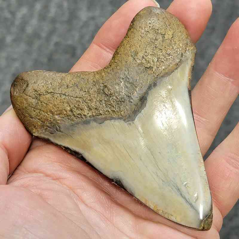 3 7/8″ – Polished Megalodon Tooth with Brown Root with Tan Enamel