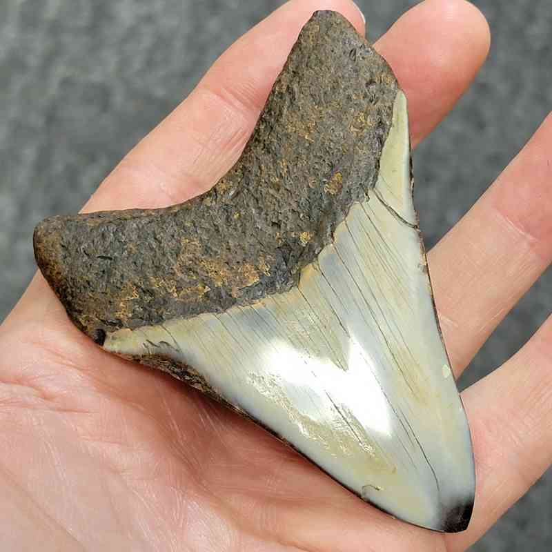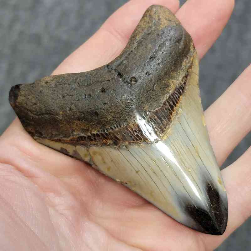 3 5/8″ – Polished Megalodon Tooth with Dark Brown Root with Gray Enamel
