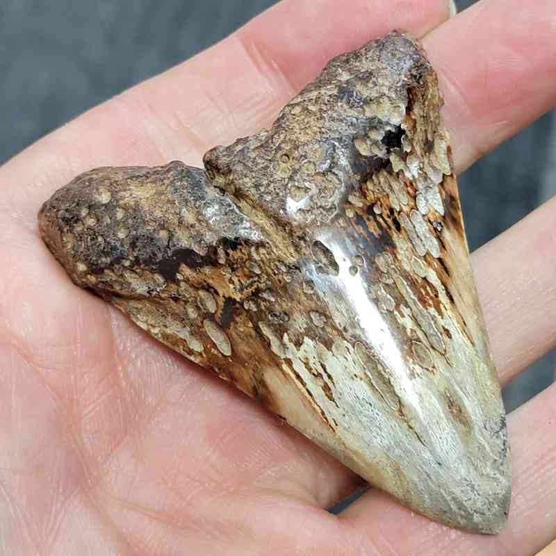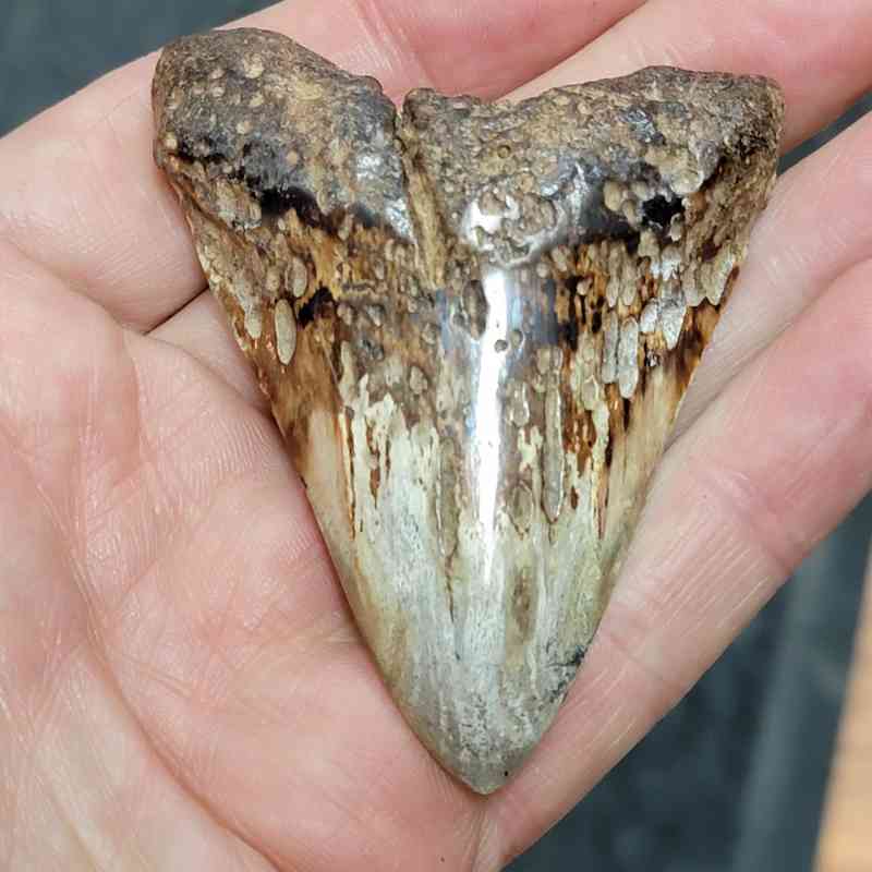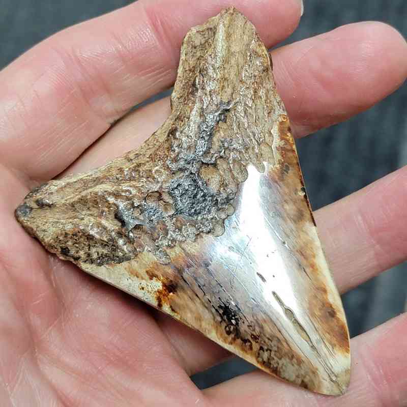3″ – 90% Complete Polished Megalodon Tooth with Mottled Brown Root with Mottled Brown/Gray Enamel