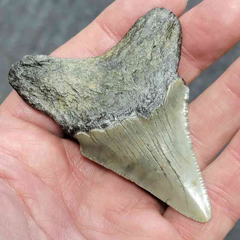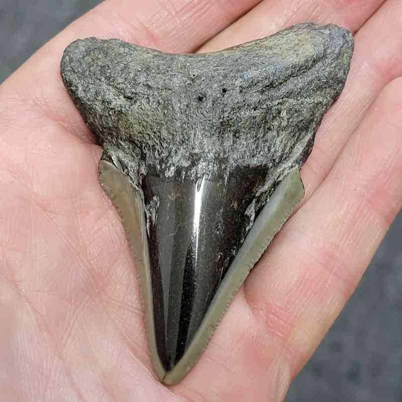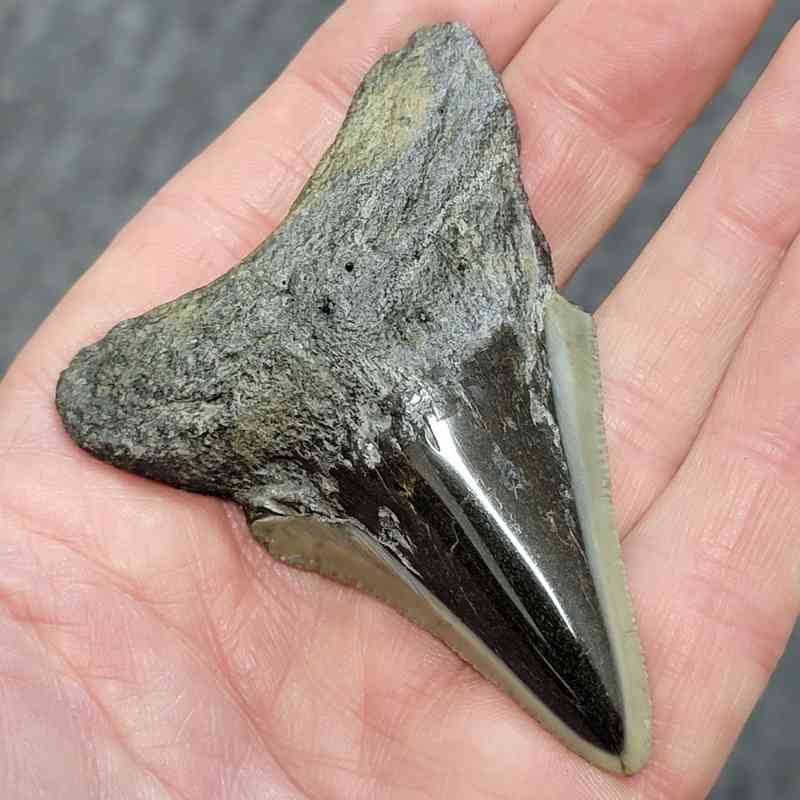 3 1/16″ – 90% Complete Polished Megalodon Tooth with Dark Brown Root with Gray Enamel